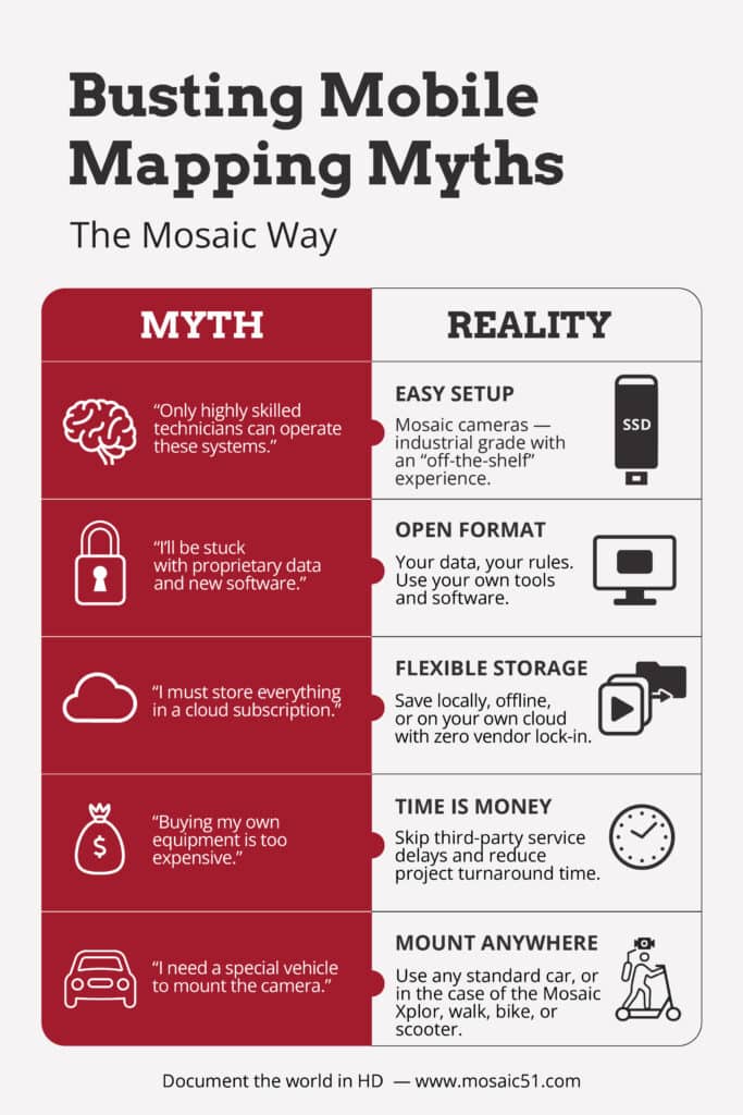 Like any new technology, mobile mapping is often shrouded in mysteries and rumors. This week, we sat down with the Mosaic sales team to discuss the most common myths our clients believe before jumping into the mobile mapping game.